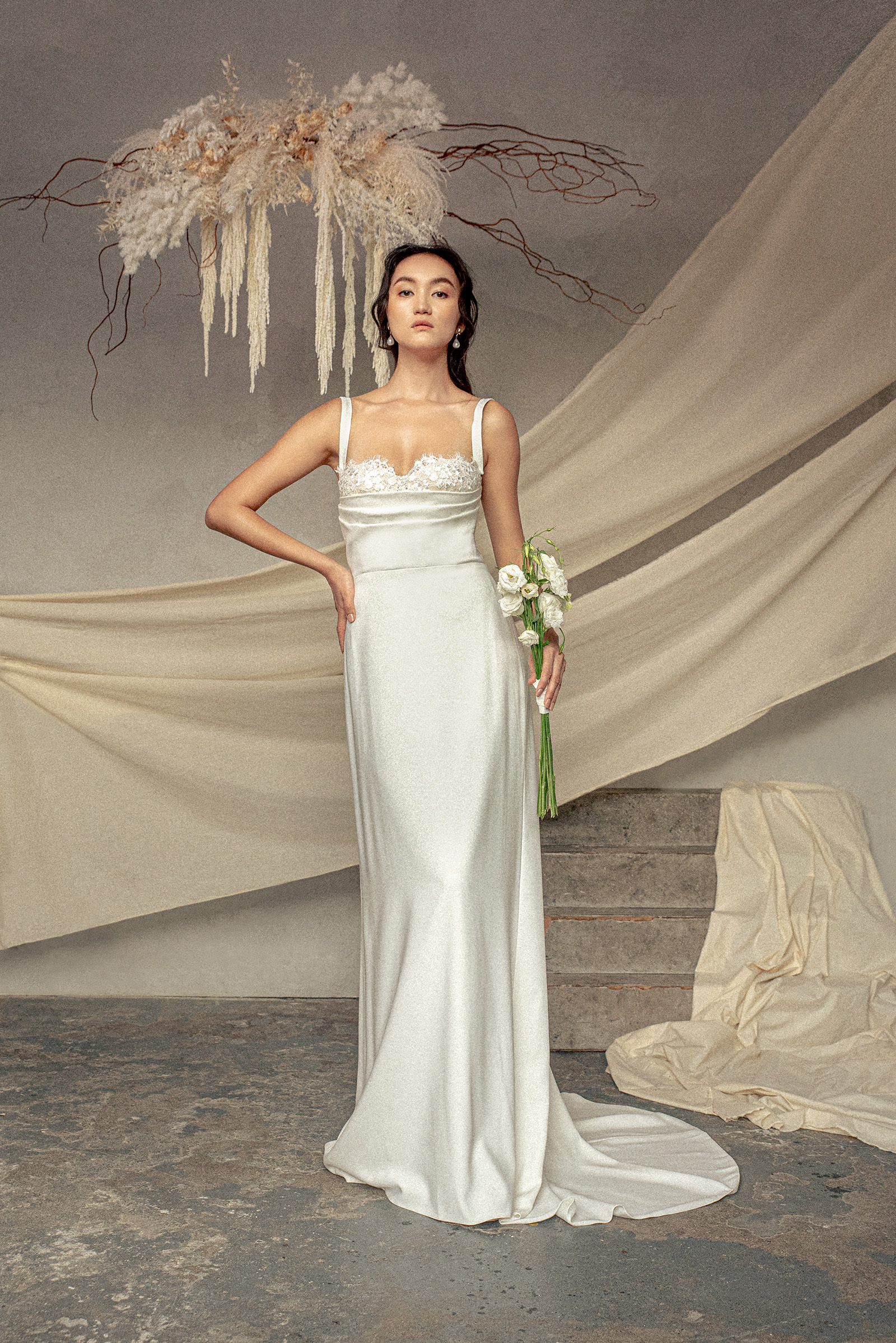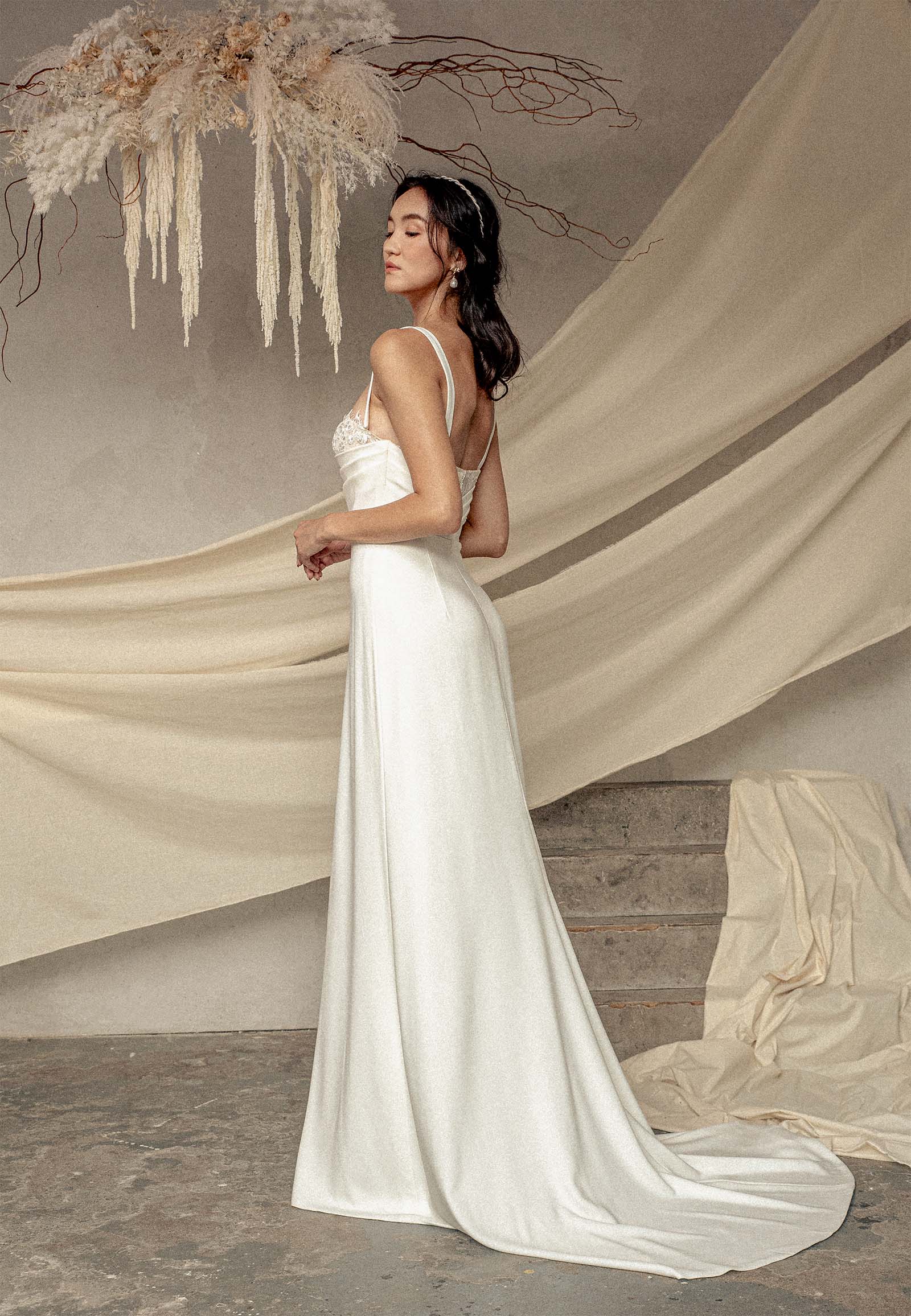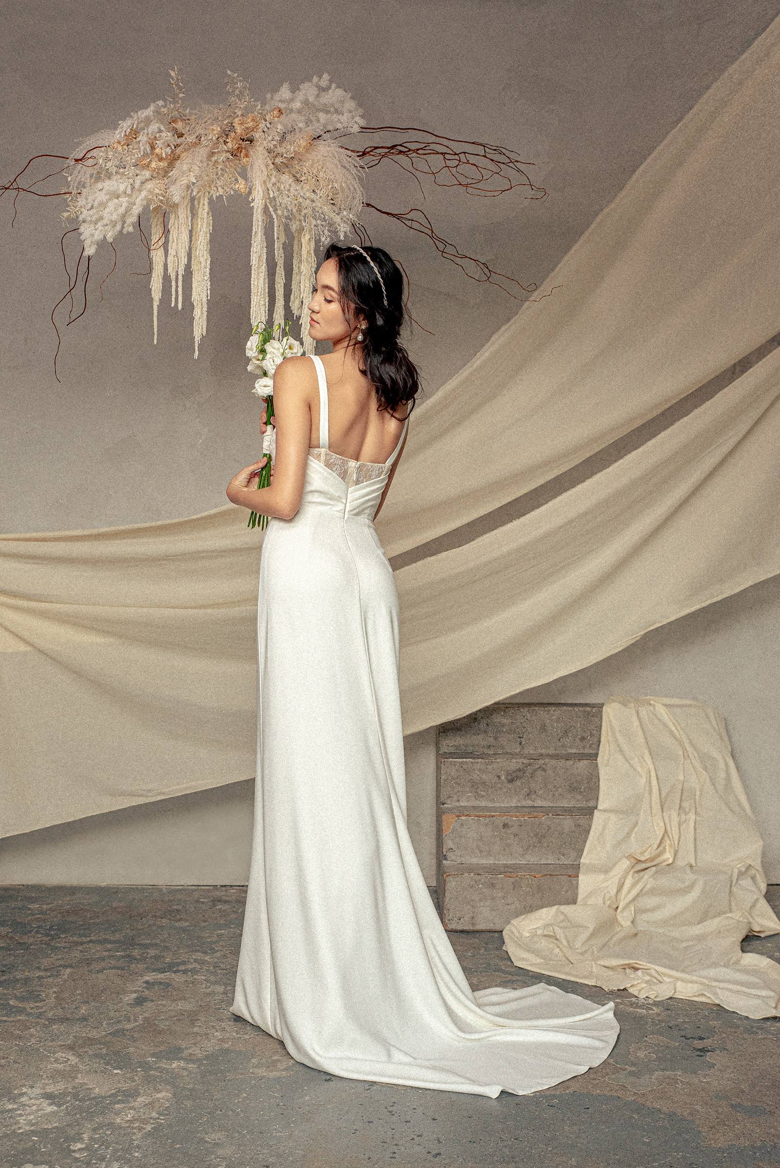 A stunning crepe column gown with luxe draped pleats over a satin bustier with hand sewn appliqué’s layered with two types of lace. With a subtle train and detachable straps, this versatile gown can appeal to a wide range of brides.